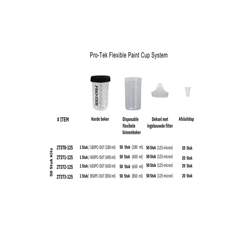 OmschrijvingHet PRO-TEK PPS (Paint Preparation System) is een professioneel wisselbekersysteem voor het efficiënt mengen, verspuiten en bewaren van lak. Met slechts één beker kun je mengen én verspuiten, waardoor je werktijd verkort en schoonmaakwerk drastisch wordt beperkt.Dankzij het gesloten systeem met ingebouwd filter wordt verontreiniging van buitenaf voorkomen en kan ongebruikte lak luchtdicht worden afgesloten en bewaard. Het systeem is verkrijgbaar in 180 ml, 400 ml, 650 ml en 850 ml en wordt compleet geleverd met de nodige toebehoren. Ideaal voor professioneel spuitwerk met maximale productiviteit en minder oplosmiddelgebruik.