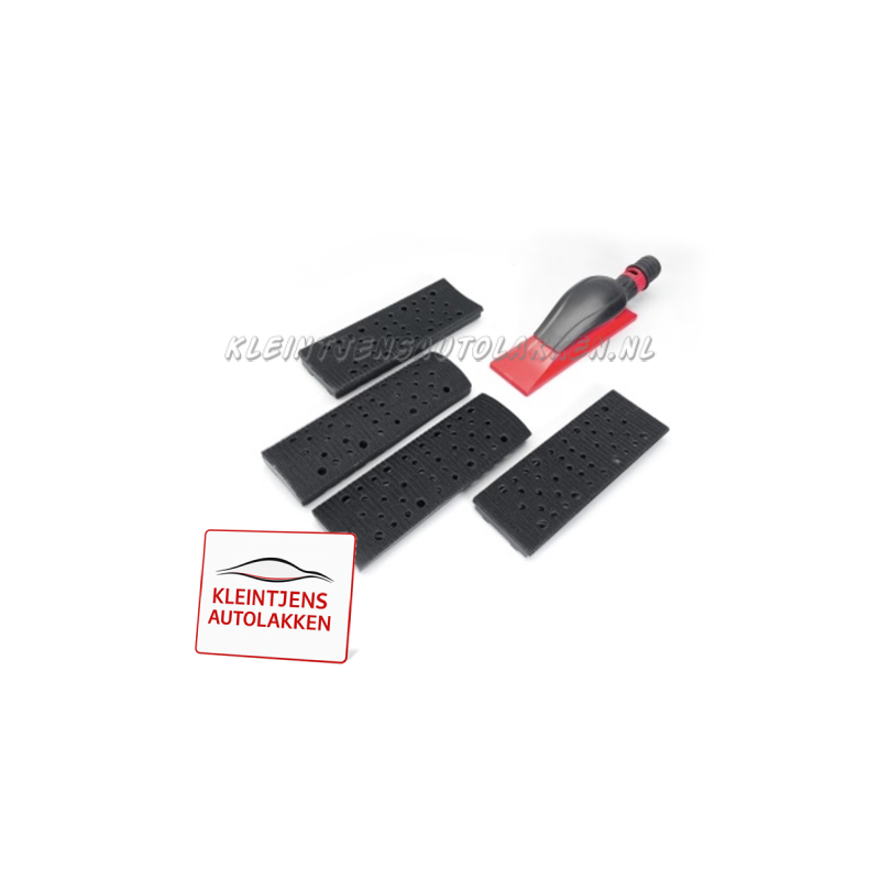 Met één vlak en drie ronde opzetstukken biedt dit handsysteem maximale flexibiliteit voor elke vorm of contour. Perfect voor het schuren van carrosserieonderdelen, bumpers, lijsten en profielvlakken.