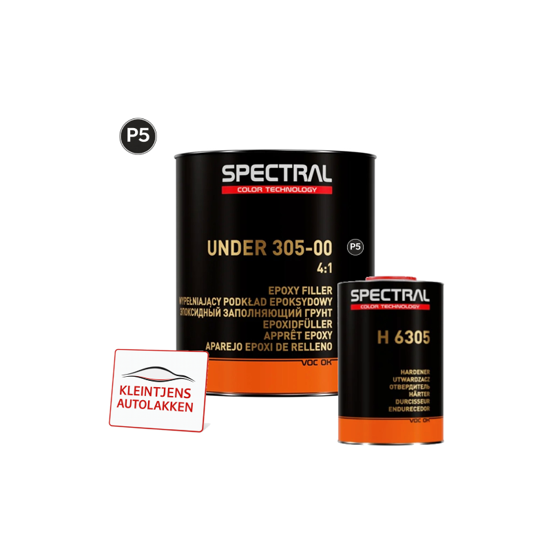 De Spectral UNDER 305-00 P5 Set is een complete 2-in-1 2K epoxy primer en filler in zwarte uitvoering, geleverd inclusief de bijbehorende H 6305 verharder. Deze professionele combinatie is ontwikkeld voor efficiënt autoschadeherstel en vervangt de traditionele opbouw van een epoxyprimer gevolgd door een acrylaatfiller. Hierdoor wordt het reparatieproces eenvoudiger en bespaar je zowel arbeidstijd als materiaalverbruik.